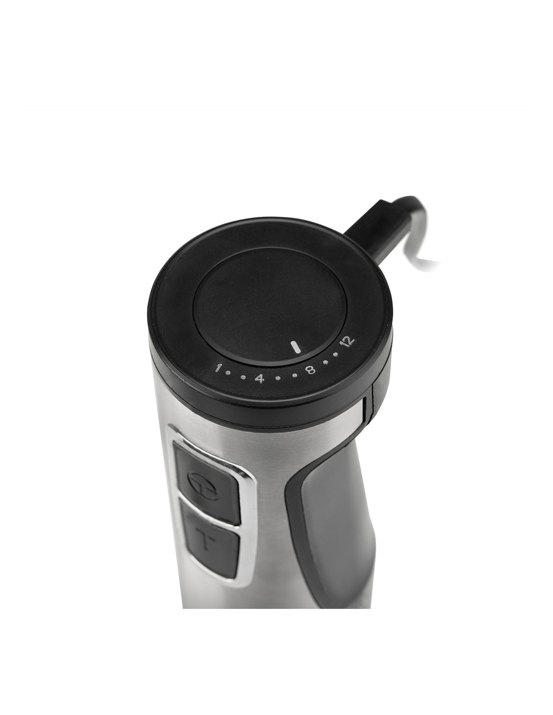 Por otro lado, sus dos pulsadores, uno que acciona la velocidad seleccionada y un segundo que activa la función turbo para un aporte extra de potencia. Además, su brazo de acero inoxidable incorpora un sistema de seguridad que evitará que este se separe del motor en funcionamiento.