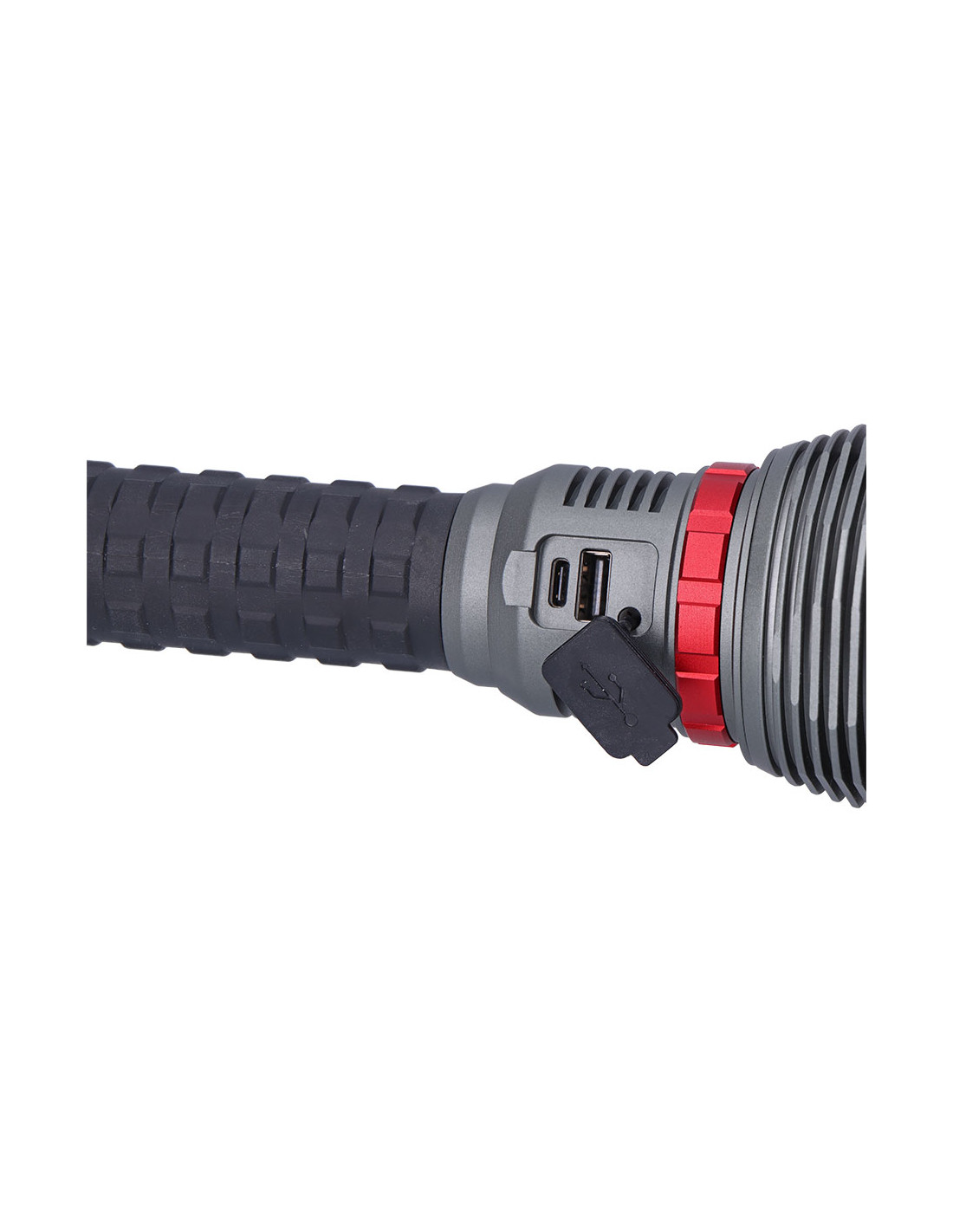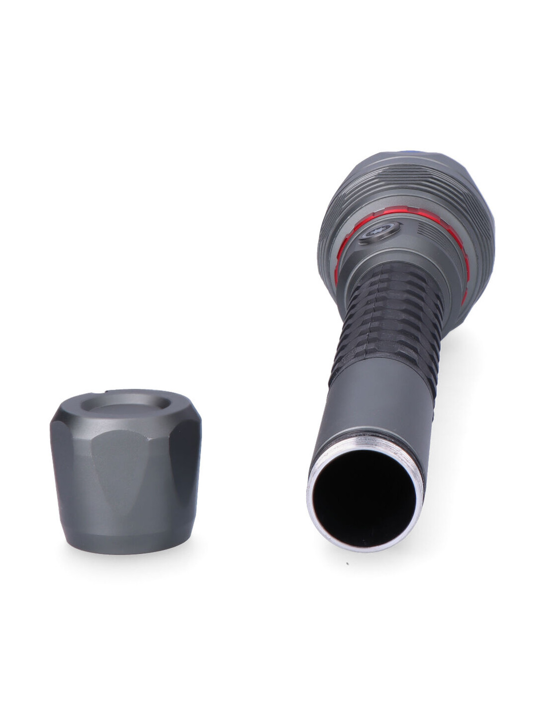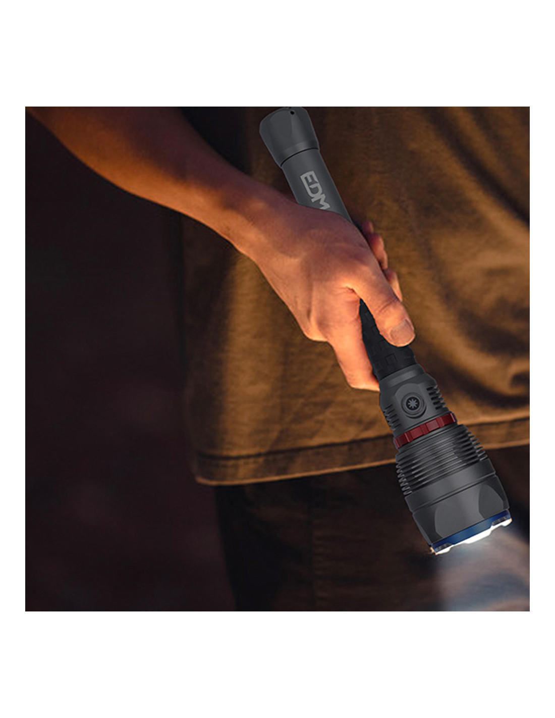 Linterna de gran alcance led, ideal para campo, caza, pesca, etc... Cuenta con una antinomia de hasta 20Hrs. Cuenta con luz estroboscópica (Flash), con función power bank para recargar tu móvil e impermeable IP67. Cuenta con 4 niveles de potencia: Turbo 18000lm (30S)/10000lm/50000lm/500lm. Tiempo de carga de 9H con indicador de carga.